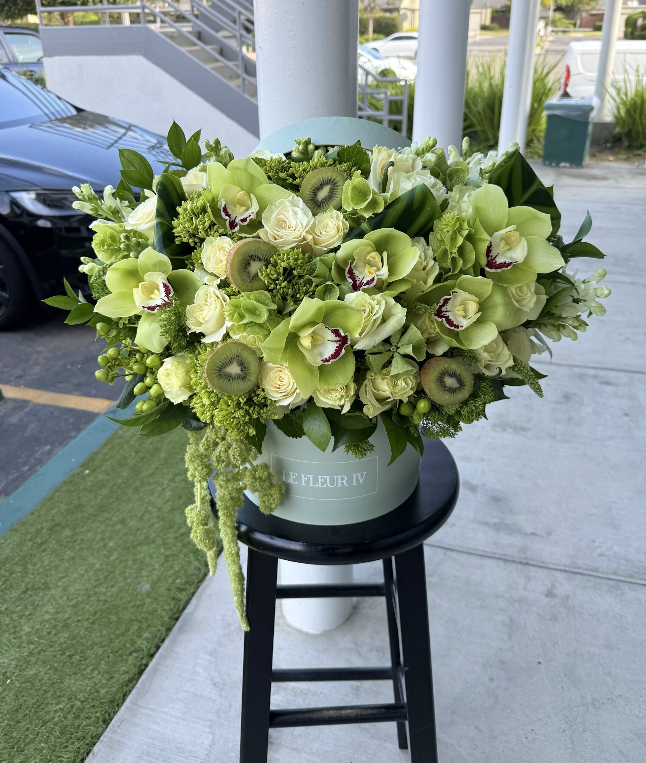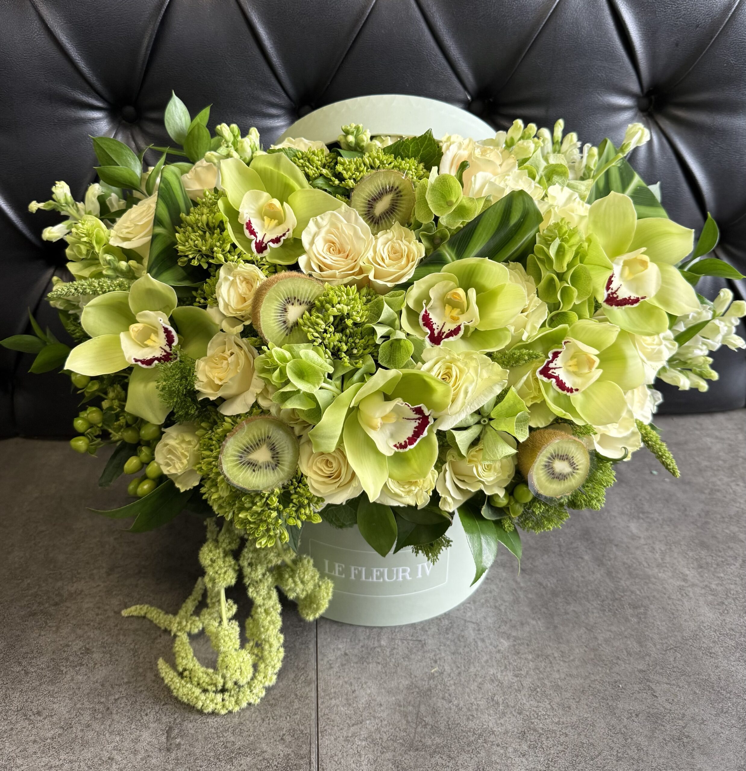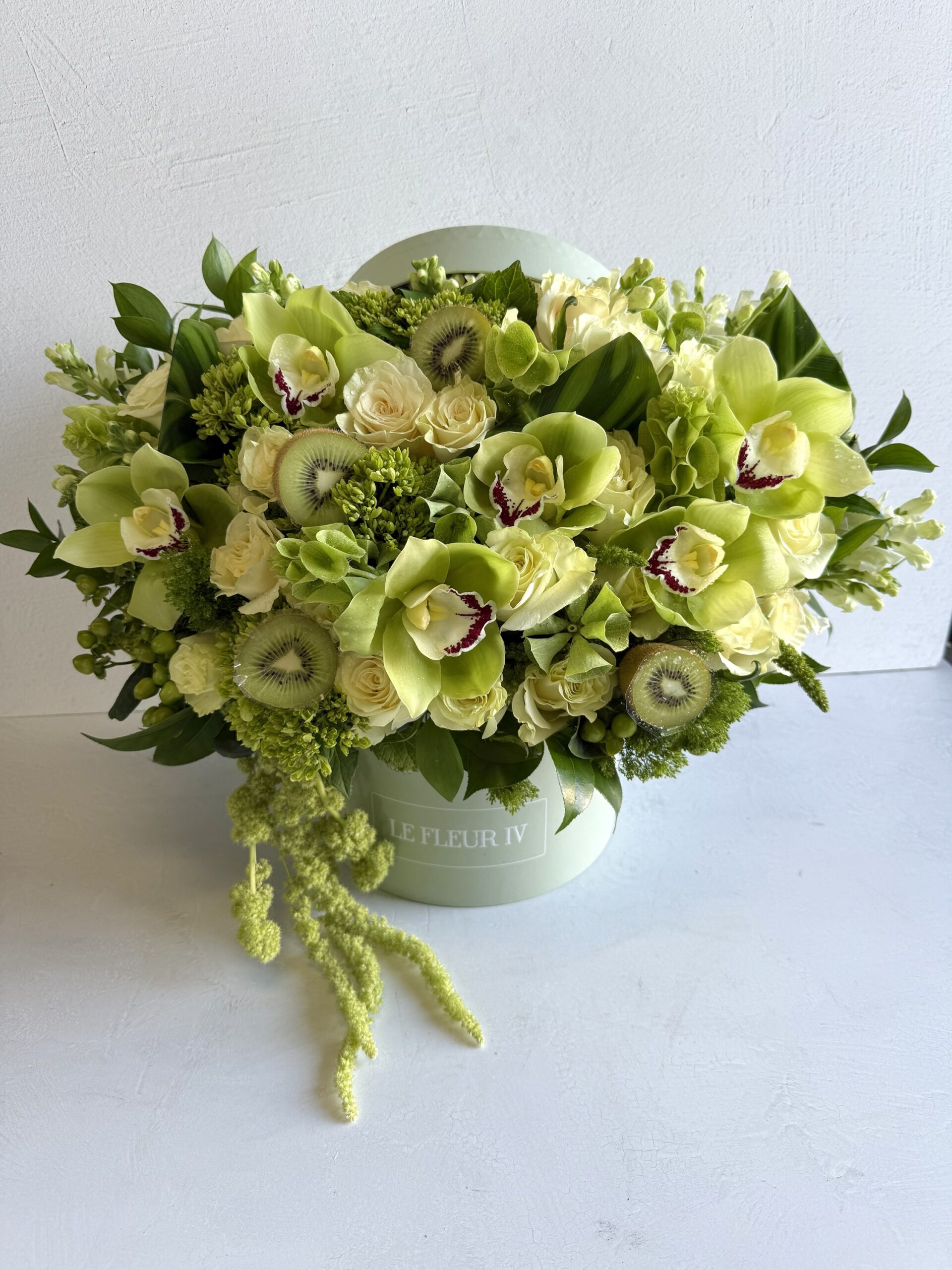 This arrangement is a luxurious and refreshing blend of elegance and creativity. It features creamy ivory roses symbolizing love, grace, and new beginnings; exotic green cymbidium orchids representing beauty, strength, and refinement; and lush greenery for a sense of vitality and abundance. The playful addition of fresh kiwi slices adds a modern, artistic twist, making the bouquet not just a floral gift but a conversation piece.