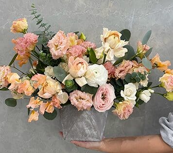 Handcrafted by our skilled florists, each petal is a testament to precision and artistry. The combination of lush greenery and a variety of blooms creates a visual symphony, making it a perfect centerpiece for any occasion. The concrete vase not only adds a contemporary touch but also ensures longevity and stability, making it a lasting symbol of your thoughtful gesture.